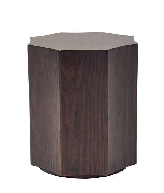 The stunning Collin side table features dark stained wood that is constructed to create the illusion of a single, carved block of solid wood.