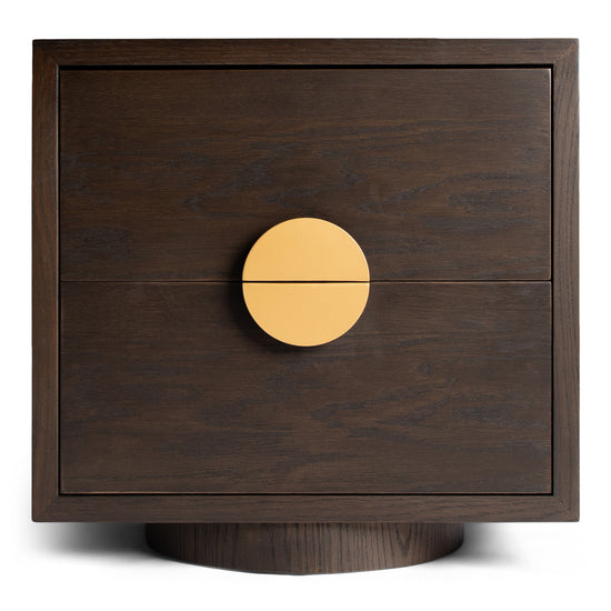 The Rebekah Locker features a single large circular brass handle at the centre of the door, creating a striking focal point on the front of the piece. The locker sits on a discreet circular wooden base, echoing the handle’s form and adding a subtle structural element to the design.