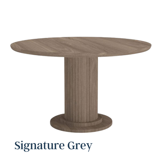 Completely bespoke, this beautiful solid ash table offers made-to-measure customisation and a wide variety of colours, from antique brown to soapy white. Built to look like it’s floating above its column-shaped pillar and louvred-effect base, the Scandinavian-inspired proportions are at once both robust and genteel. The 4cm tabletop is curved and softly-sanded at the edge, adding a velvet-like smoothness under diners’ fingertips.